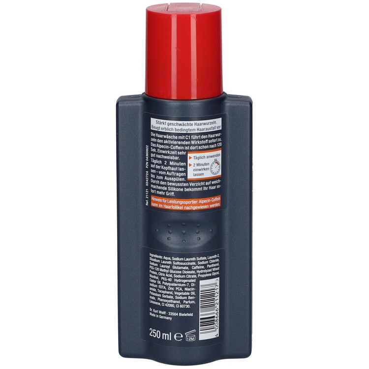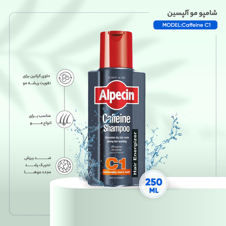 شامپو ضد ریزش و تقویت‌کننده موی آقایان آلپسین، سازگار با انواع مو، حاوی کراتین، کافئین، ویتامین‌های A، B3، با حجم 250 میلی‌لیتر مدل Caffeine C1